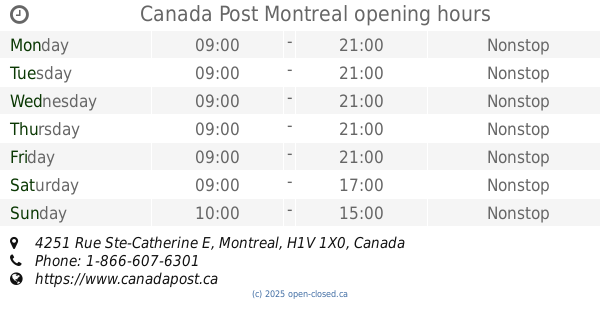 It is also possible to : Edit these OPENING HOURS of Branch Canada Post In Montreal, 4251 Rue Ste-Catherine E,