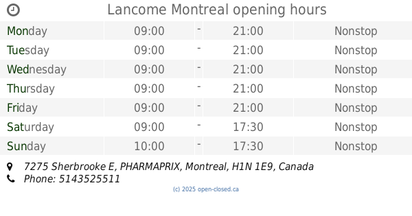 It is also possible to : Edit these OPENING HOURS of Store Lancome In Montreal, 7275 Sherbrooke E, PHARMAPRIX,