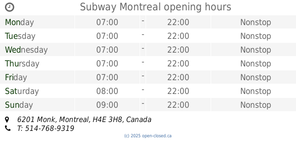 It is also possible to : Edit these OPENING HOURS of Restaurant Subway In Montreal, 6201 Monk,