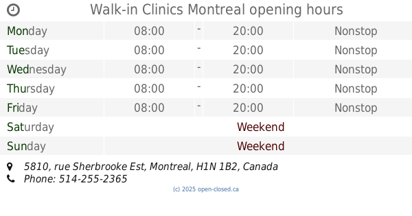 It is also possible to : Edit these OPENING HOURS of Store Walk-in Clinics In Montreal, 5810, rue Sherbrooke Est,
